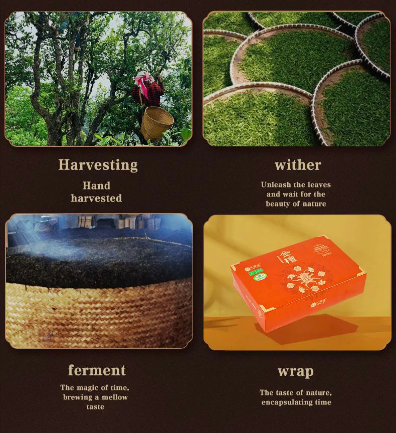 Organic Ancient Tree Ripened Pu-erh “Jin Tan”: Imperial Tribute Legacy | Cedar-Infused Golden Liquor – Crown Jewel of Jingdong’s Ecological Sanctuary This 2024 harvest tea originates from the core organic sanctuary of Jingdong, Pu-erh, packaged in elegant gift boxes containing 18 stone-pressed discs (5g per disc, 90g net weight per box), each wrapped in traditional cotton paper. Sourced from century-old trees thriving under the “Forest-Cap & Tree-Belt” ecosystem (ancient tea groves sheltered by mountain-top forests and camphor/cypress belts), it embodies the pinnacle of Yunnan’s tea terroir.