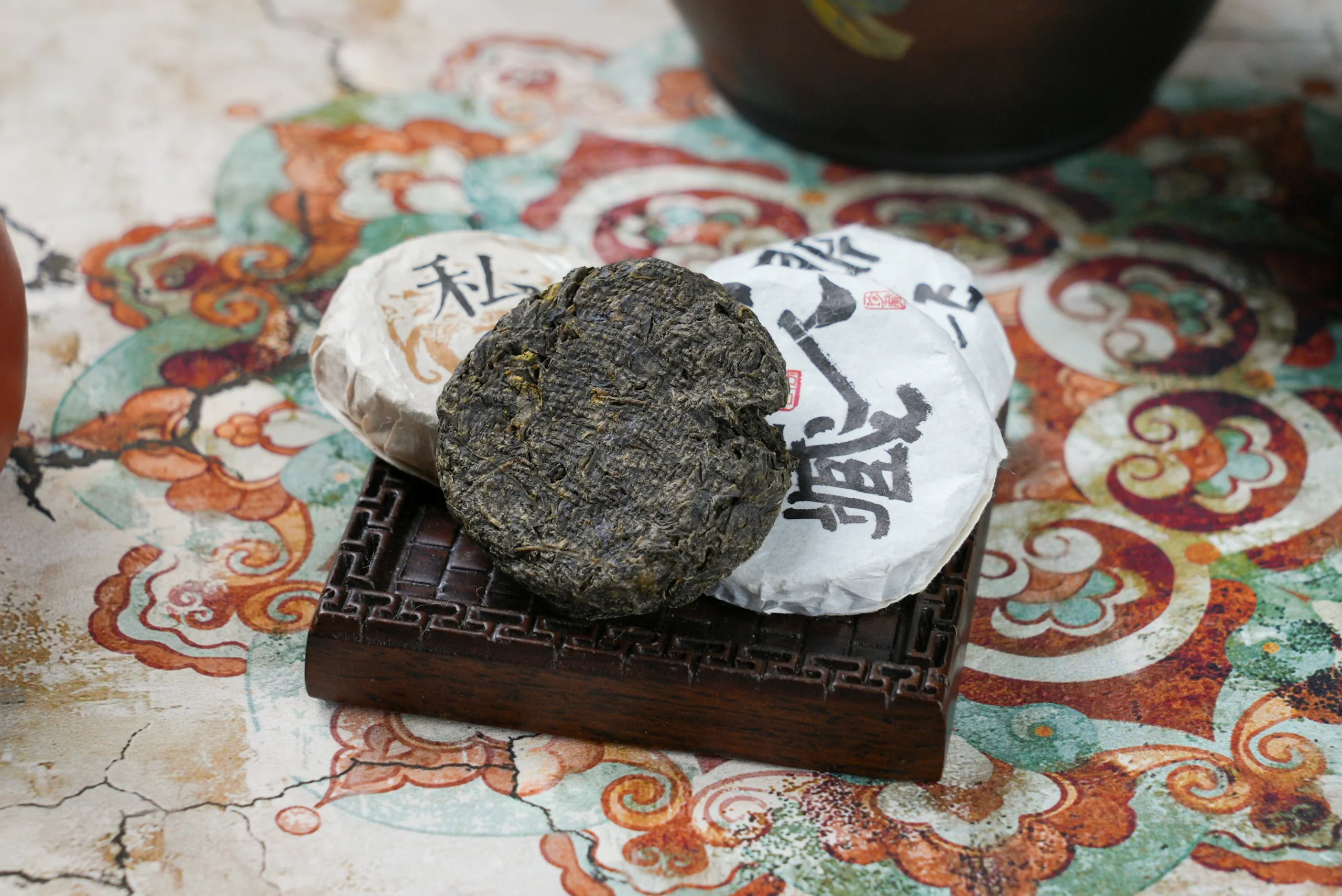 Five individually wrapped cakes (5g each) nest in kraft paper bags printed with Tang-era floral motifs from Dunhuang manuscripts. Unwrap rice paper to reveal dark-brown cakes with purple tips, exuding orchid and candied plum notes. Brewed at 95°C, the liquor shimmers with golden halo, delivering spring-stream sweetness and honeyed velvet texture, finishing with moonlit-bamboo coolness.