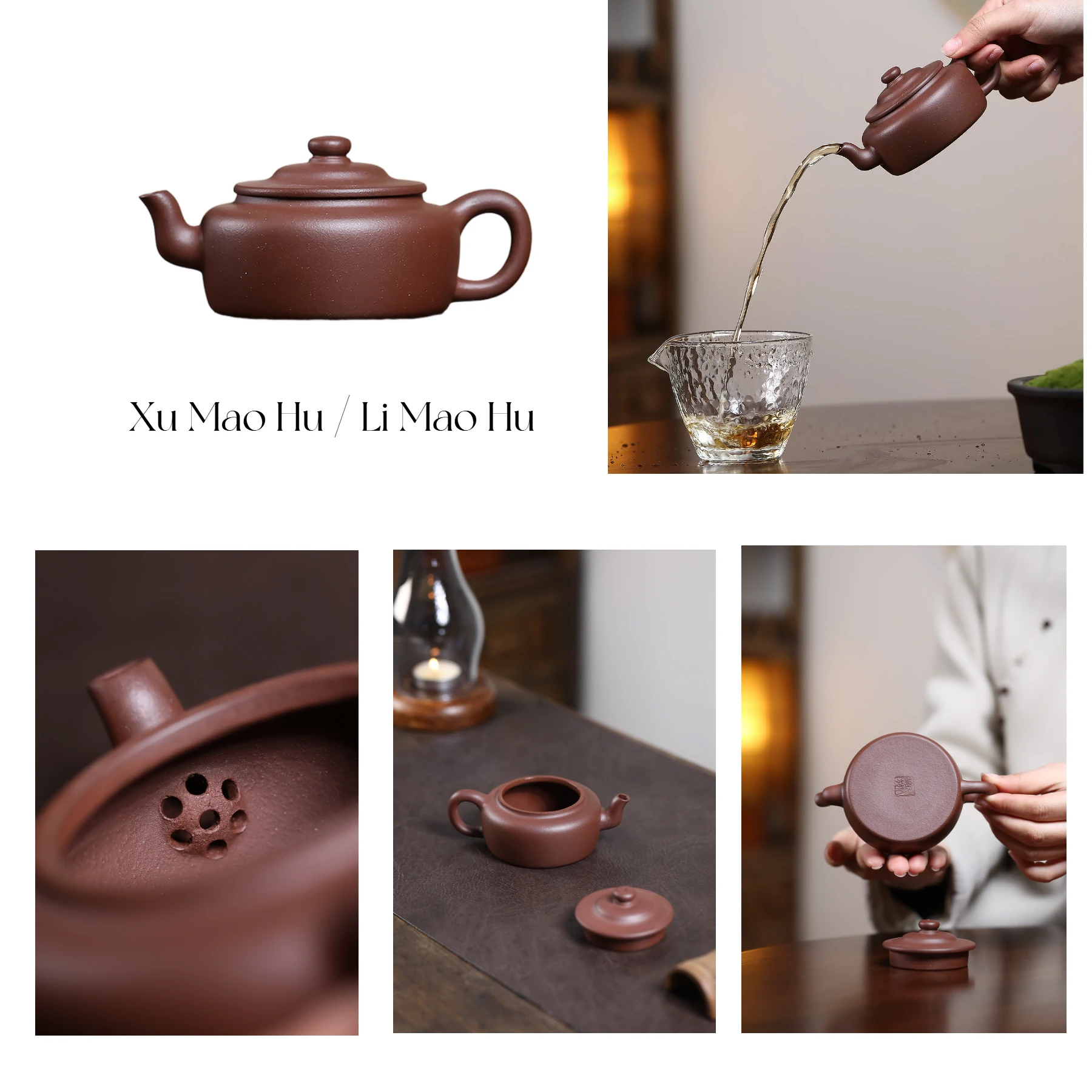 Tea Experience: The wide hat lid offers practical ease for adding leaves and cleaning. The ample chamber allows full tea expression. Xu Mao Hu with an overhead handle possesses enhanced spatial elegance; holding it feels like grasping a fishing rod, serene and content. Versatile for various teas, pairing exceptionally well with the delicate nature of Greens or Whites, creating a tranquil, unhurried tea atmosphere.