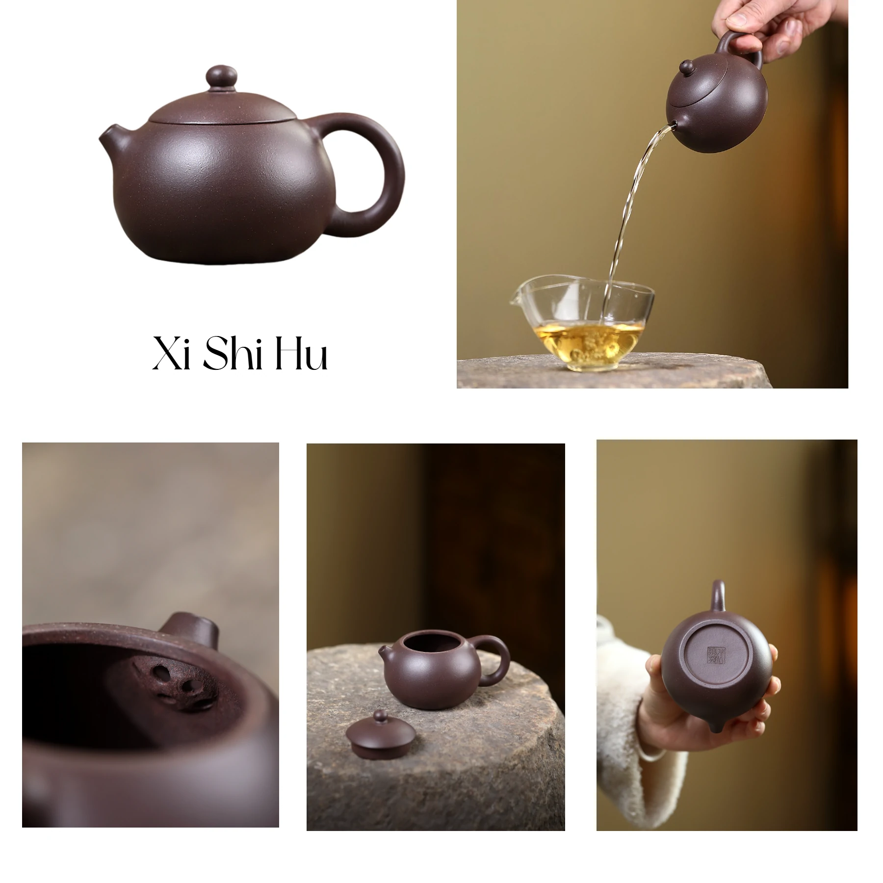 Xi Shi Hu (西施壶): Inspired by the ancient Chinese beauty Xi Shi, it symbolizes elegance and grace. The body is voluptuously rounded with graceful curves, characterized by its compact and exquisite size, often paired with a distinctive reverse handle and short spout. Despite its small size, the full shape accommodates tea leaf expansion well. The short spout ensures smooth water flow, and the reverse handle provides light, comfortable handling. It is especially suitable for brewing highly fragrant teas like Oolong and Black tea, facilitating tea appreciation and aroma enjoyment. Holding it feels like cradling a beauty.